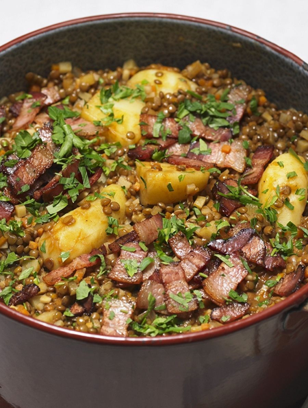• Deftiger Linsentopf mit Speck und Kartoffeln