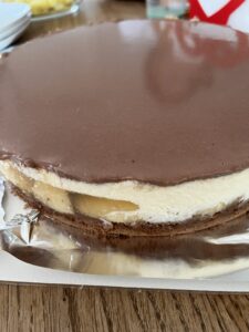 1. Gelatine nach Packungsaufschrift einweichen. Sahne mit Zucker fast steif schlagen, die ausgedrückte, aufgelöste Gelatine auf einmal dazugeben und Sahne vollkommen steif schlagen. Die Masse auf den erkalteten Tortenguss streichen.