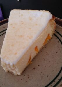 Kurz vor Ende der Backzeit Eiweiß in einem Rührbecher mit dem Mixer (Rührstäbe) auf höchster Stufe sehr steif schlagen. Zucker nach und nach auf höchster Stufe unterschlagen. Eiweißmasse auf den heißen Kuchen streichen und mehrmals mit einer Gabel durchziehen, so dass ein Muster entsteht. Kuchen erneut in den Backofen schieben und fertig backen. Backofentemperatur reduzieren.